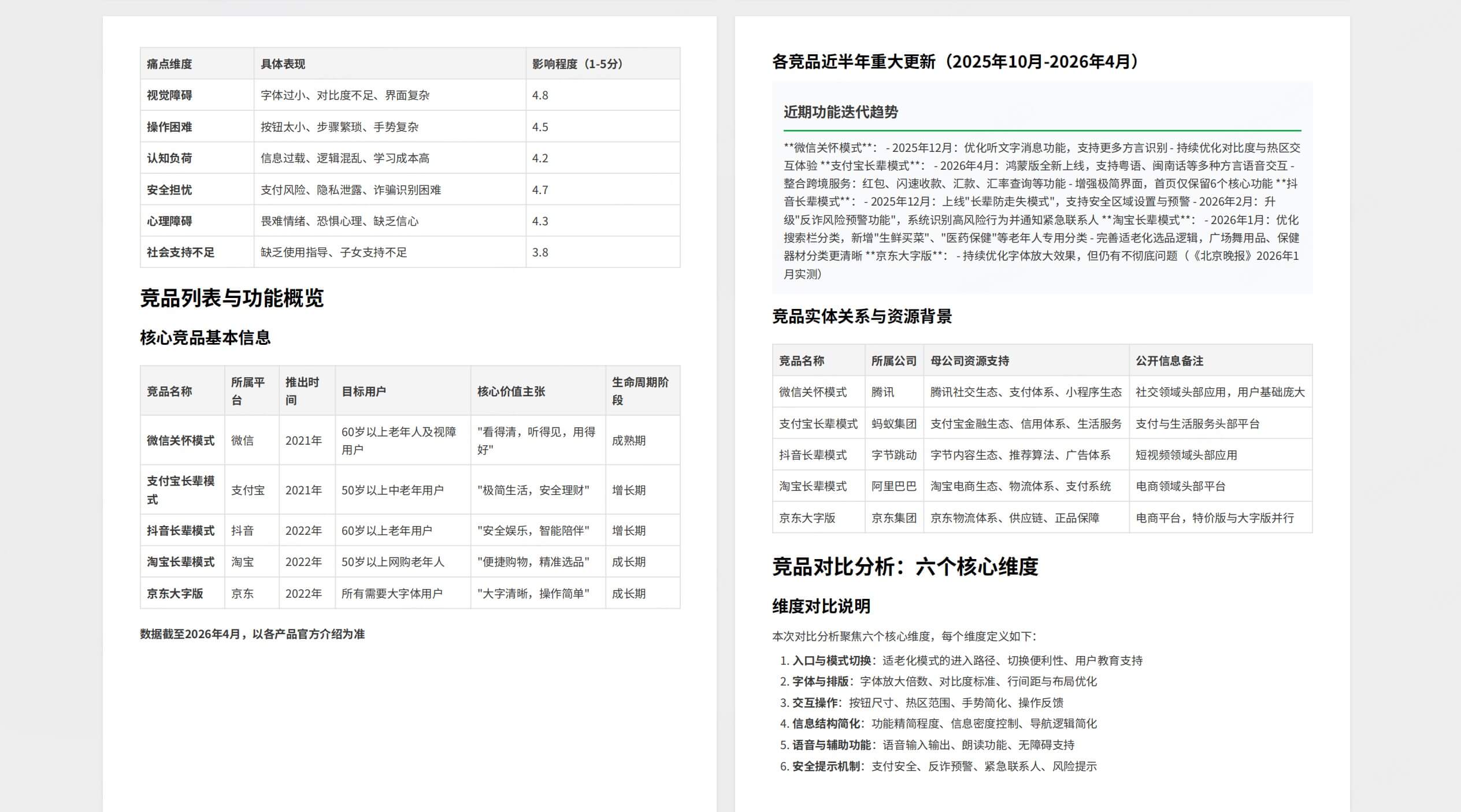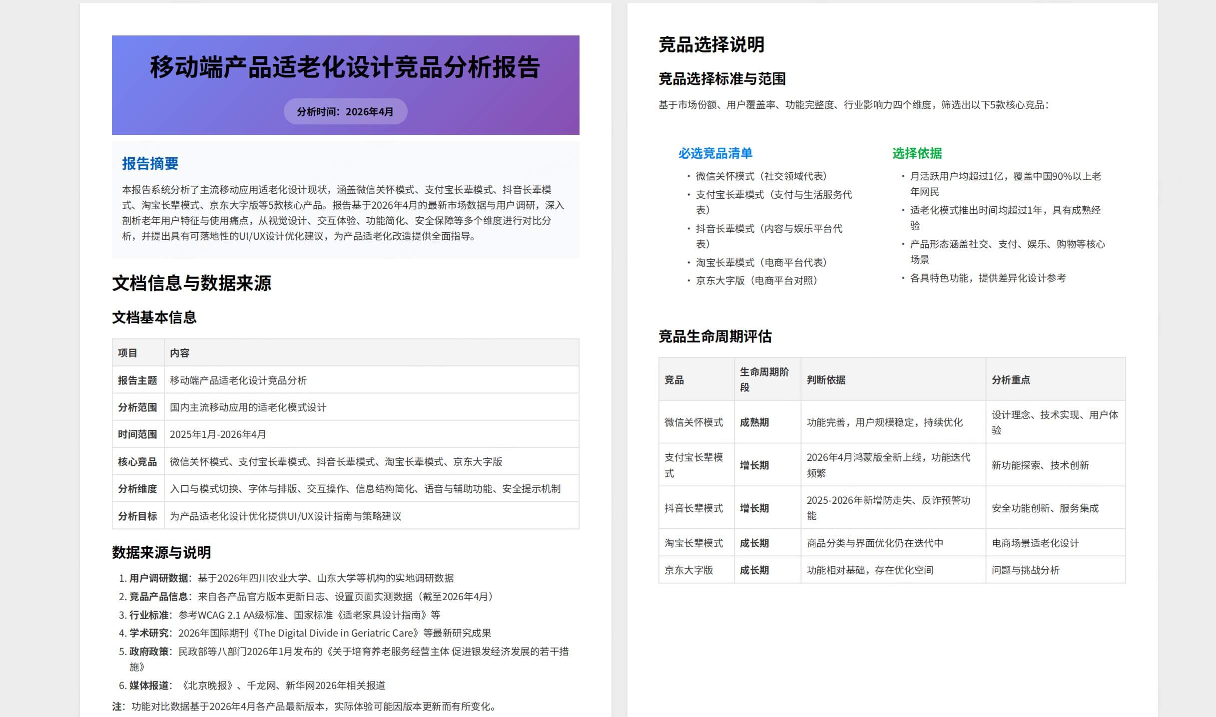 接着输入你的需求,这一步很关键。比如你可以写:“请你作为一名资深产品经理,帮我生成一份移动端产品适老化设计竞品分析报告,用于产品功能优化。分析对象包括(如:微信、支付宝、抖音等已上线适老化模式的产品)。请从老年用户特征与使用痛点出发,对各竞品的适老化设计进行对比分析,重点包括:入口与模式切换、字体与排版、交互操作(按钮与流程)、信息结构简化、语音与辅助功能以及安全提示机制;同时总结各产品的优缺点与设计亮点,并结合分析结果给出适老化设计的优化建议。要求结构清晰、逻辑完整。”点击免费注册体验墨刀AI一键生成竞品分析报告。