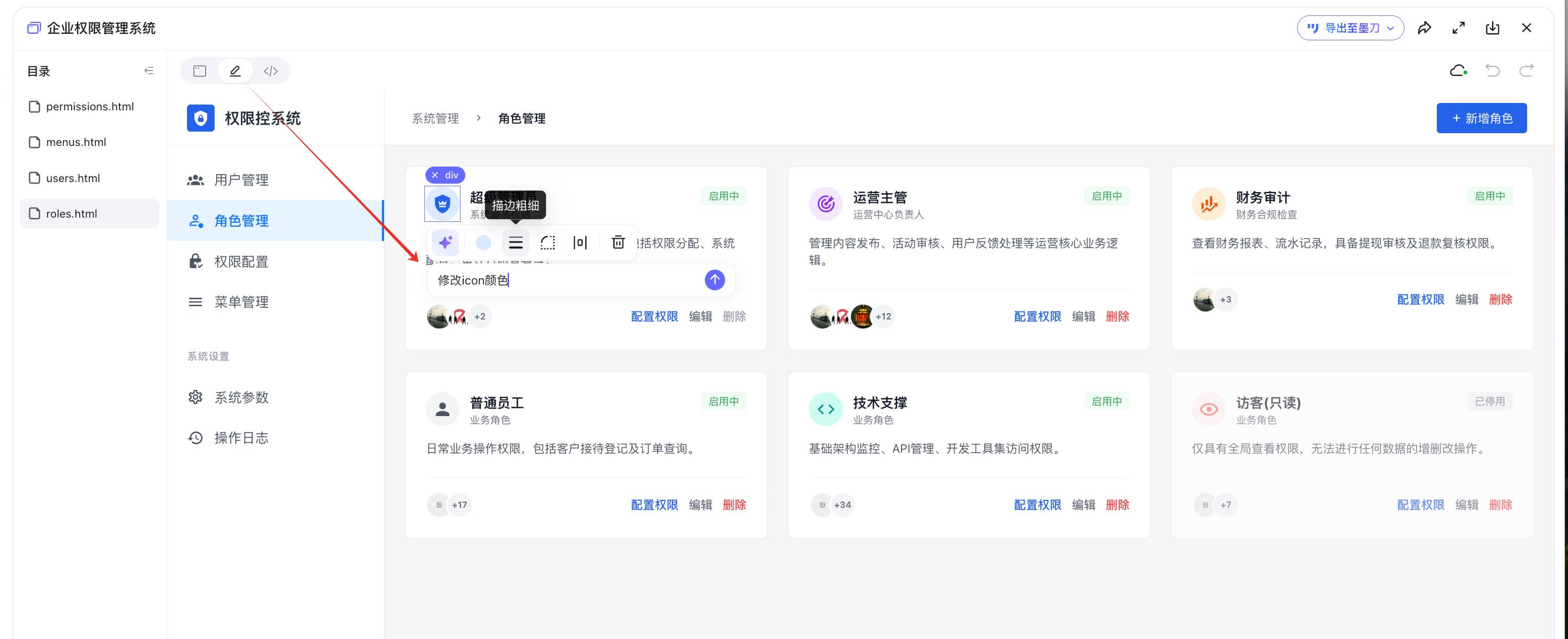 生成原型页面:在墨刀AI Agent中输入Prompt,AI会根据描述自动生成初版权限系统原型,包括角色管理界面、权限设置页、审批流程界面等核心模块。