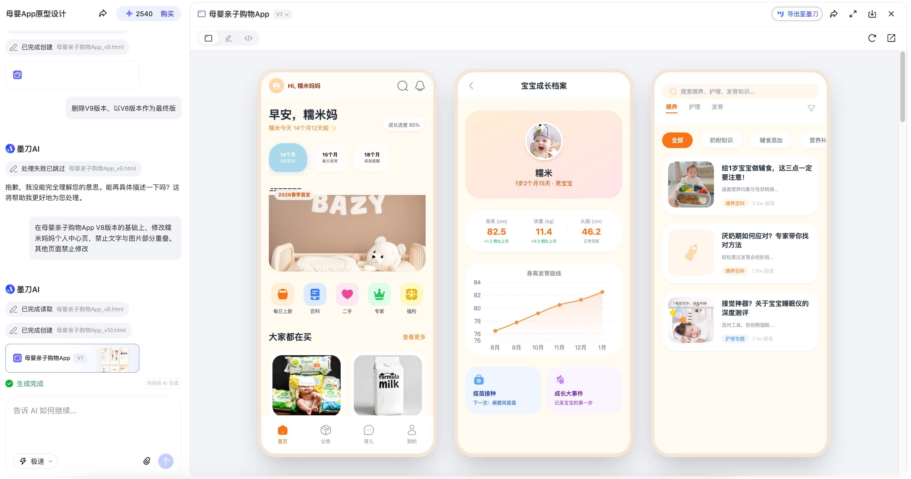 接下来,我们用一个母婴APP原型设计案例,来看看如何通过墨刀AI在几分钟内完成一个高保真、可交互、可编辑的原型生成。