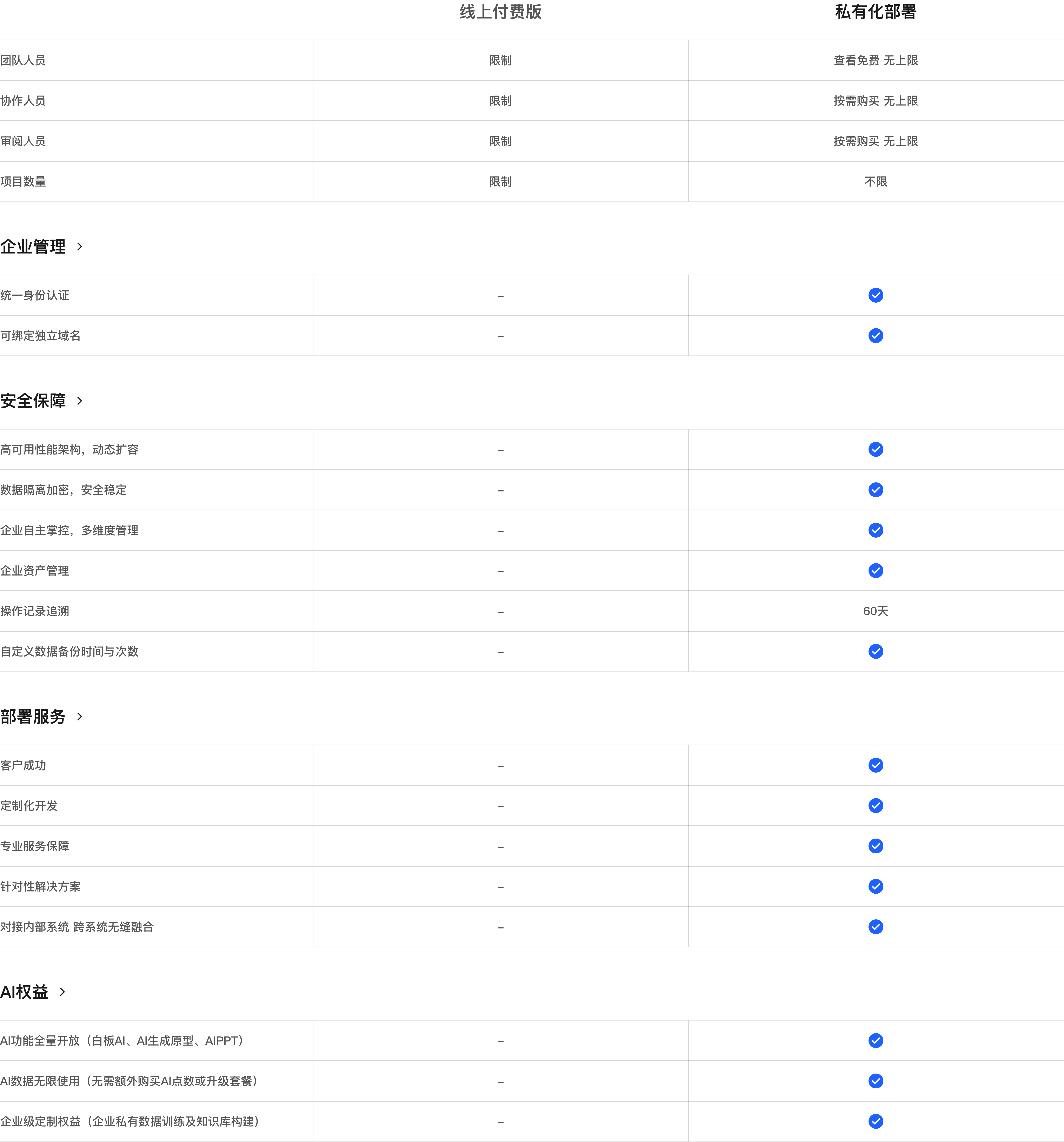 线上已有项目可平滑迁移至私有化部署版本;升级迁移后,支持存储资源、席位随业务变化动态扩容